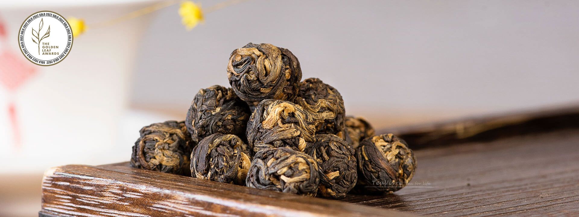 The hand-rolled pearls are large and dark with golden tips visible on the surface. Each pearl is tightly compressed and heavy for its size. Dry aroma presents rich chocolate, earthy tobacco, and honey with malty undertones.