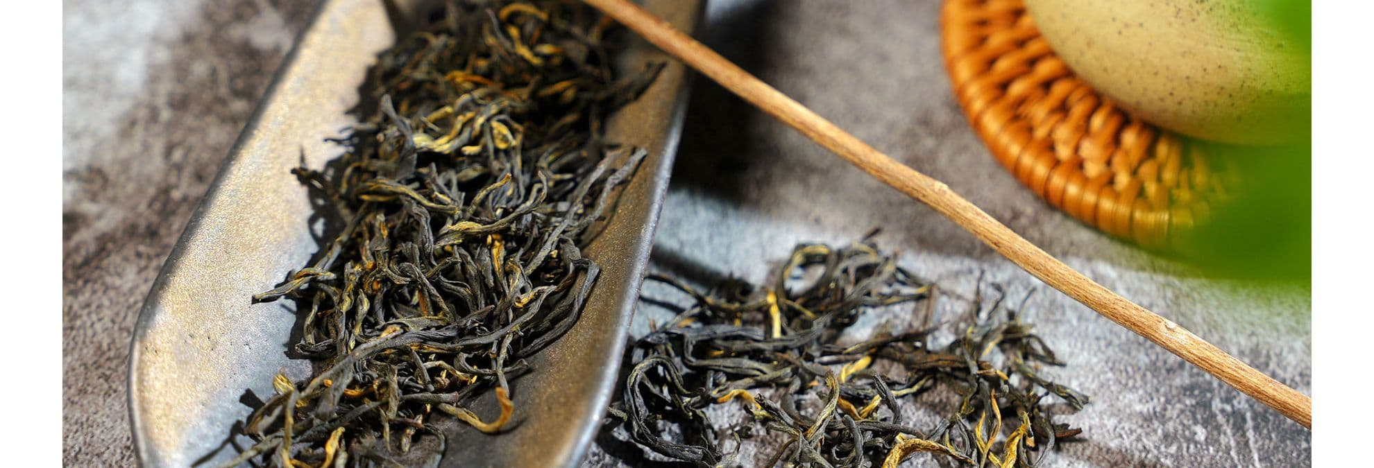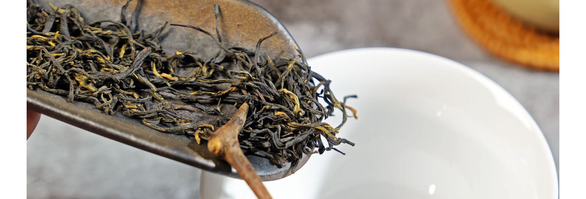 The leaves feature golden-orange buds mixed with darker twisted leaves, showing two-tone coloring. Bud content is high, contributing to the premium designation. Dry leaf aroma offers sweet potato, floral sweetness, and roasted notes with hints of cocoa.