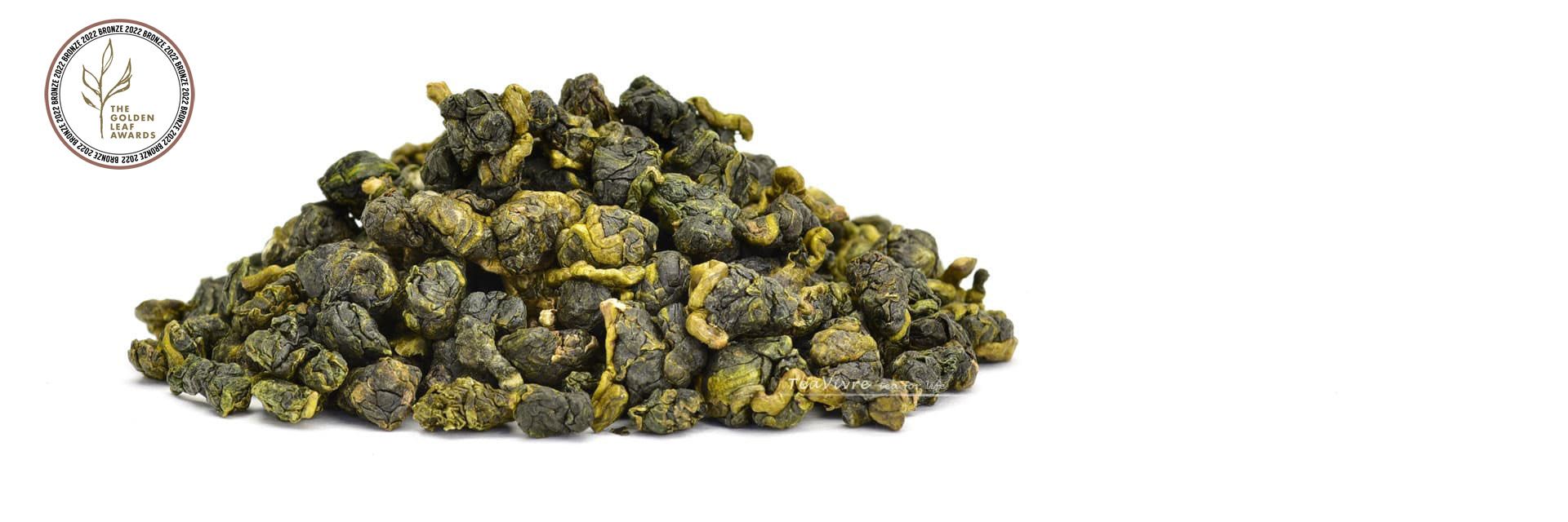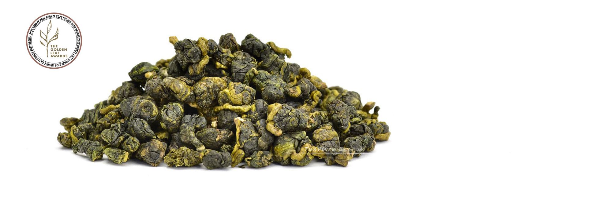 The rolled balls are medium green with glossy appearance from partial oxidation. Shape is looser than high-mountain varieties, with leaves visible within the rolling. Dry aroma is notably creamy with milk character and fresh floral scent.